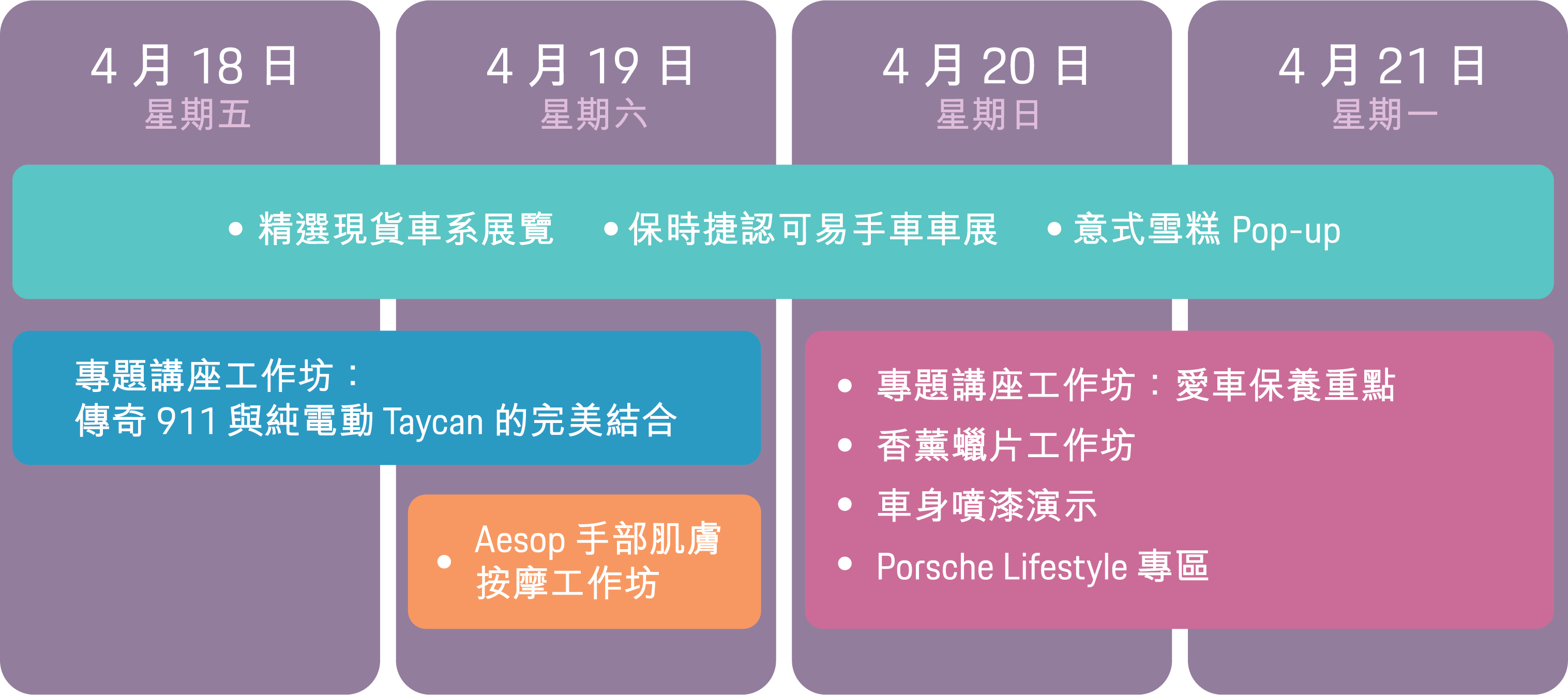 傳奇跑車 911 與純電動 Taycan 的完美融合(只限 4 月 18 及 19 日):由保時捷專業團隊向您講解傳奇跑車 911 與純電動 Taycan 的完美融合——當經典工藝遇上創新科技,又會產生什麼樣的火花?保養重點專題講座(只限 4 月 20 及 21 日):探討保時捷原廠保養的重要性以及如何確保您的愛車始終處於最佳狀態